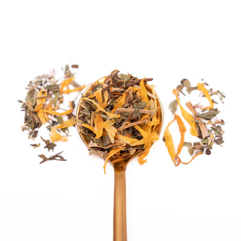 100% certified organic Dandelion leaf, Nettles, Plantain, Cleavers, Red Clover, Calendula, Milk Thistle, Peppermint